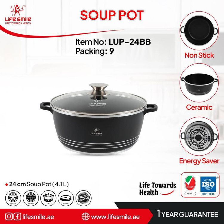 قابلمه لایف اسمایل LUP-24BB یکی دیگر از محصولات برند لایف اسمایل است. جنس اصلی قابلمه از آلومینیوم ریختهگری است که بسیار مقاوم بوده و رسانای خوبی برای انتقال حرارت است. انتقال یکنواخت حرارت موجب پخت یکنواخت مواد غذایی میشود. قابلمه دارای روکش داخلی سرامیکی بوده که مواد غذایی به کف آن نخواهد چسبید و شستشو آن آسان خواهد بود. از این محصول میتوانید بر روی انواع اجاق گاز از جمله نوع القایی استفاده کنید. قابلمه سرامیکی LIFE SMILE LUP-24BB دارای یک درب از جنس شیشه است که به کاربر امکان مشاهده درون قابلمه را می دهد و باعث نظارت بیشتر او بر روی پخت و پز میشود. بر روی درب به منظور جلوگیری از سر ریز شدن مواد درون قابلمه، یک دریچه خروج بخار طراحی شده است. برای ایمنی بیشتر و همچنین جابجایی راحتتر قابلمه، دستگیرهها به صورت یکپارچه با بدنه تولید شدهاند. رنگ این قابلمه مشکی و اندازه آن 24 سانتی متر است.