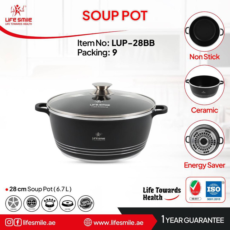 قابلمه لایف اسمایل LUP-28BB یکی دیگر از محصولات برند لایف اسمایل است. جنس اصلی قابلمه از آلومینیوم ریختهگری است که بسیار مقاوم بوده و رسانای خوبی برای انتقال حرارت است. انتقال یکنواخت حرارت موجب پخت یکنواخت مواد غذایی میشود. قابلمه دارای روکش داخلی سرامیکی بوده که مواد غذایی به کف آن نخواهد چسبید و شستشو آن آسان خواهد بود. از این محصول میتوانید بر روی انواع اجاق گاز از جمله نوع القایی استفاده کنید. قابلمه سرامیکی LIFE SMILE LUP-28BB دارای یک درب از جنس شیشه است که به کاربر امکان مشاهده درون قابلمه را می دهد و باعث نظارت بیشتر او بر روی پخت و پز میشود. بر روی درب به منظور جلوگیری از سر ریز شدن مواد درون قابلمه، یک دریچه خروج بخار طراحی شده است. برای ایمنی بیشتر و همچنین جابجایی راحتتر قابلمه، دستگیرهها به صورت یکپارچه با بدنه تولید شدهاند. رنگ این قابلمه مشکی و اندازه آن 28 سانتی متر است