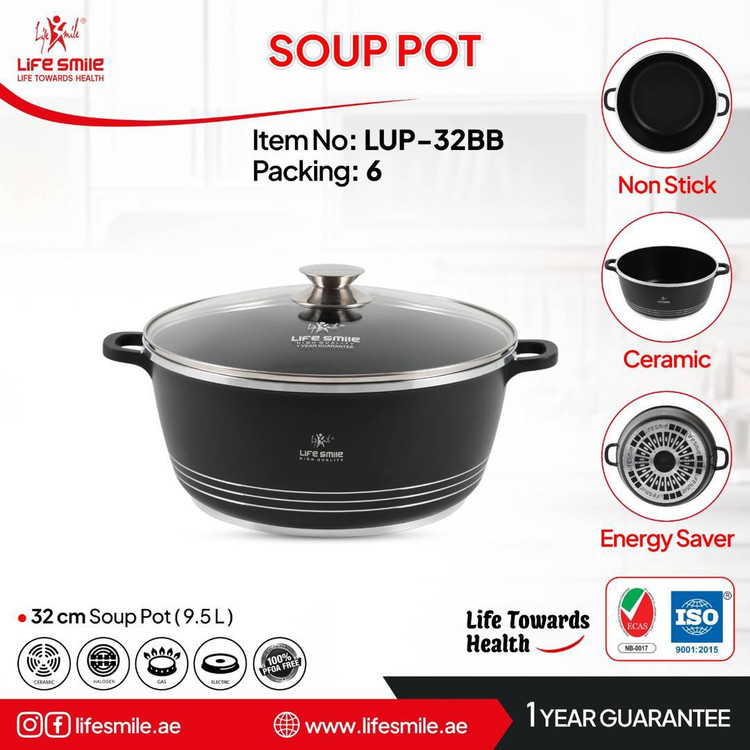 قابلمه سرامیکی LIFE SMILE LUP 32BB در اندازه 32 سانتی متری تولید شده است. درب شیشهای قابلمه در برابر حرارت بسیار مقاوم است و کاربر میتواند فرایند پخت مواد غذایی را بدون برداشتن درب مشاهده کند. روی درب به منظور جلوگیری از سر رفتن غذاها یک دریچه خروج بخار تعبیه شده است. دستگیرهها به صورت یکپارچه با بدنه تولید شده و ایمنی را برای کاربر به همراه خواهد داشت. از قابلمه لایف اسمایل میتوانید علاوه بر مایکروویو، بر روی انواع اجاقها از جمله هالوژنی، سرامیکی، برقی و گازی استفاده کنید.